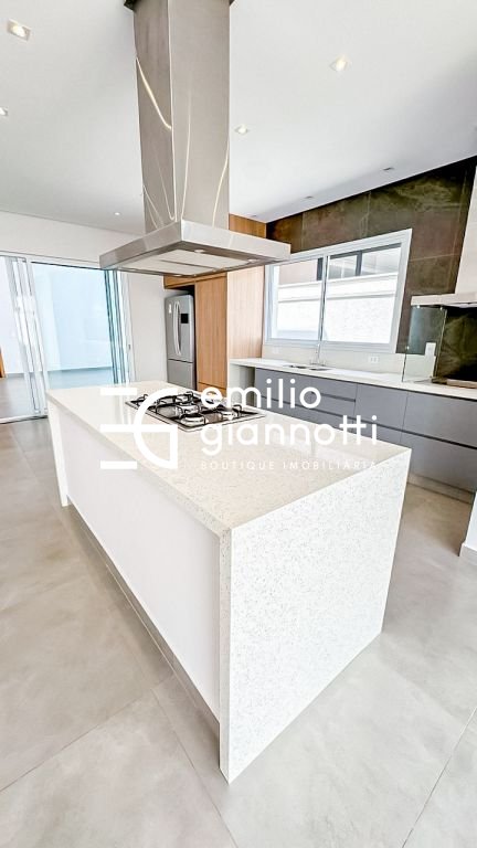 . Ilha em quatrzo branco estelar, cooktop e coifa em aço inox